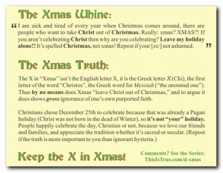 Xmas– This term is yet another source of outrage among the Christmas purists who are convinced by Fox News that subversive, godless, gay sympathizing Communist Atheists are trying with all their resources to wrest the blessed Christmas Holiday away from much abused and persecuted Evangelicals.