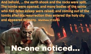 Zombies Revisited-There are many incredible whoppers in the Evangelicals inerrant Bible, but these verses trump them all with regards to belly-laughing absurdity.Matthew 27:51-53 states: